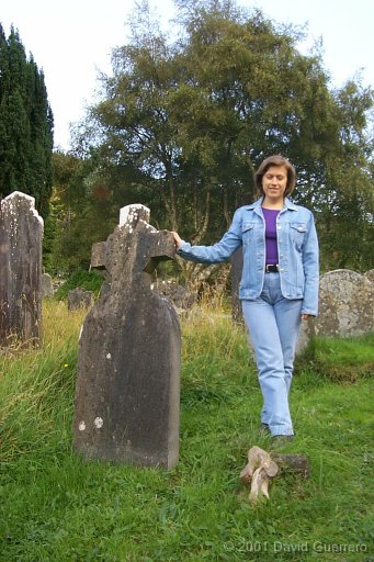 Yolanda en el cementerio que rodea la torre ciíndrica