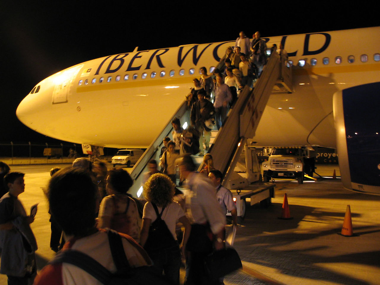 ...y así de agotados descendíamos por la pasarela 10 horas y media más tarde, trás la ya habitual y esperada "bofetada de calor" al abrirse las puertas en el aeropuerto de Cancún