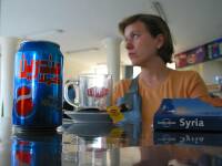 Nos levantamos a las 7:15 con la idea de coger un autobús temprano hacia Homs, pero un problema en el hotel para procesar nuestra tarjeta de crédito retrasó nuestra salida hasta las 9:45. La estación de autobuses de Alepo se llama Ibrahim Hanano, y un taxi hasta allí nos costó 50 SYP. Trás un ligero registro del equipaje para acceder a la misma, encontramos fácilmente la oficina de una compañía de autobuses, United Transport, que opera frecuentes autobuses a Homs. Los dos tickets nos salen por 150 SYP. El viaje dura sólo dos horas, y esta vez no hay caramelos, pero nos entregan una botella de agua "sin marca" pero sellada a la entrada del autobús. El intercambio de autobuses se realiza en la estación de Homs, que se encuentra en las afueras de la localidad y donde hay poco que ver, aparte de sus modernas instalaciones. El primer inconveniente lo encontramos a la hora de localizar alguna empresa de las que allí tienen oficinas, que viaje a Palmira. Todos los horarios y tablas de destinos están en árabe, pero sorprendentemente Yolanda, ayudada por las equivalencias al árabe de la guía Lonely Planet, localiza con éxito la adecuada. Son sólo 100 SYP por cabeza y dos horas de espera, así que nos apalancamos en la cafetería y a base de Lipton Tea y Mandarin Cola (CocaCola y Pepsi están prohibidas en Siria) esperamos a que llegue el momento de abordar el último autobús del día.
