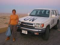 La puesta de sol es sobre el desierto sitio es excepcional y nos permite por primera vez comprobar las dimensiones de las ruinas desde las alturas. A la salida nos hacemos fotos con un vehículo de Naciones Unidas.
