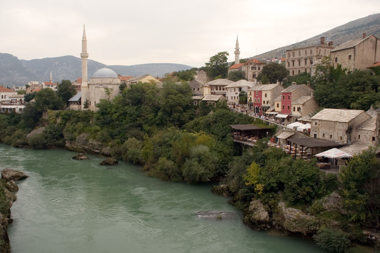 Vista del rio Neretva desde lo alto del puente de Mostar (Stari Most), con las mezquitas del barrio musulmán al fondo.